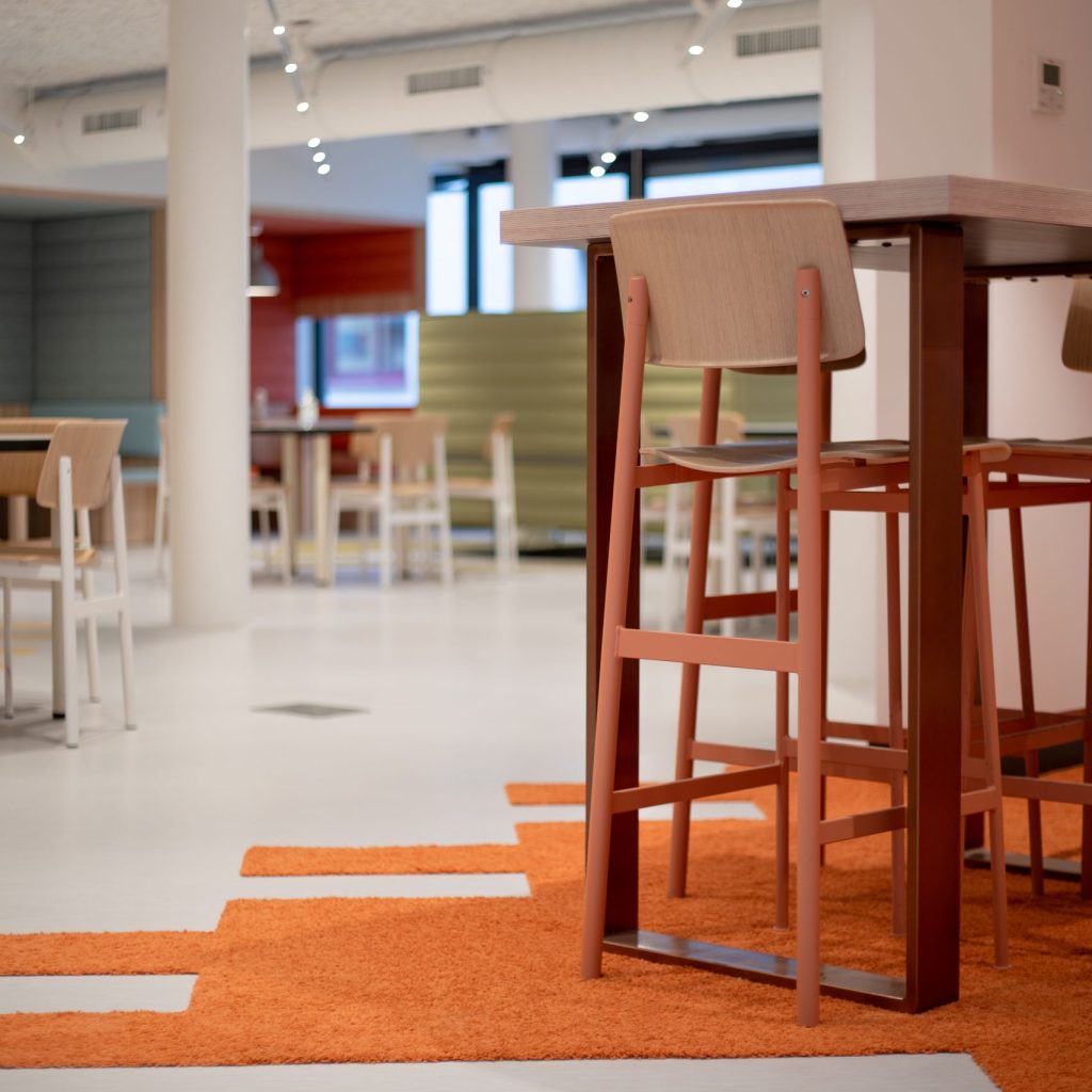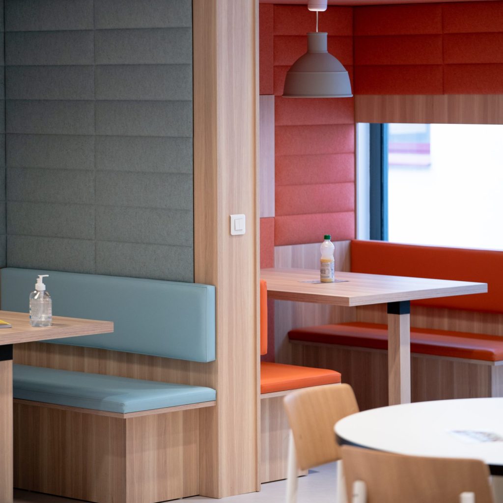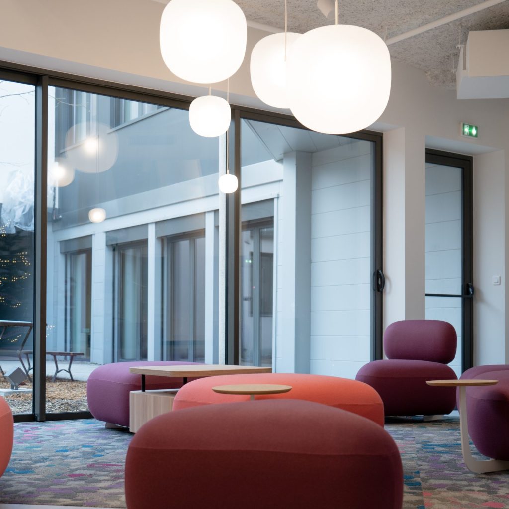 Unser Team war an der Neugestaltung der Gemeinschaftsräume des Hauptsitzes von Maped mit einem modernen und funktionalen Ansatz beteiligt. Durch die Integration von Pastelltönen und spielerischen Designelementen, wie Sofas und Schaukeln, schufen wir eine Umgebung, die zum Entspannen und zur Zusammenarbeit einlädt. Das Forum, ein multifunktionaler Raum, kombiniert Catering, Coworking und vernetzte Bereiche und markiert den Beginn einer ehrgeizigen Umgestaltung der Arbeitsräume bei Maped.